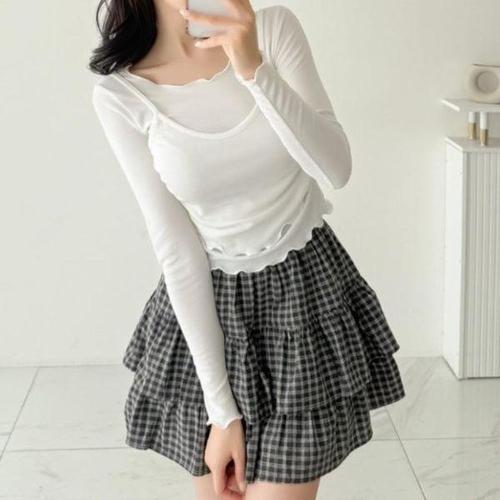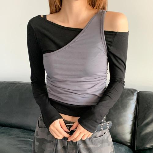 [신상오픈런]여성 레이온 레이어드 나시 물결 셔링 긴팔 티셔츠