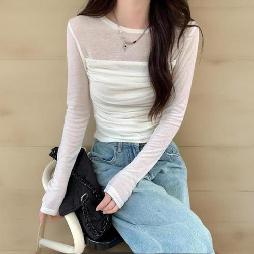 [신상오픈런]여성 슬리브리스 긴팔 티셔츠 시스루 바스트 셔링 힙무드