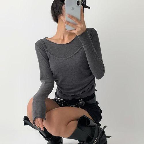 옷자락 / 여자 날라리 레이어드 골지나시 크롭 옆셔링 티셔츠
