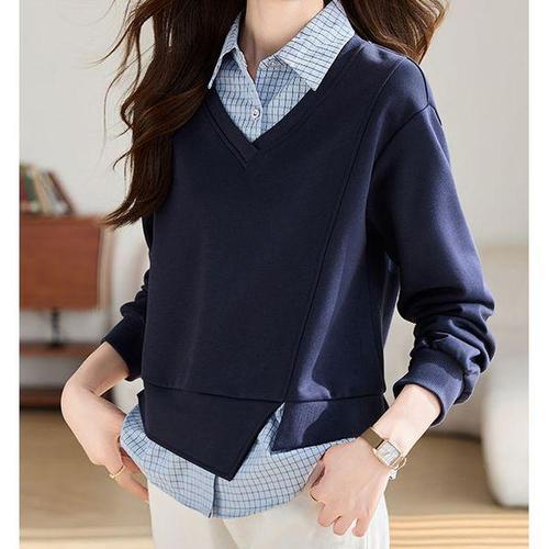 AOKADA 여성 레이어드 카라 체크 셔츠 맨투맨 티셔츠 투인원 상의