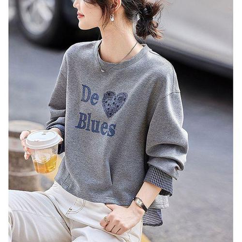 besteffie 여성용 캐주얼 넉넉한 루즈핏 레터링 프린트 맨투맨 긴소매 봄 가을 면 혼방 레이어드 셔츠티 K69
