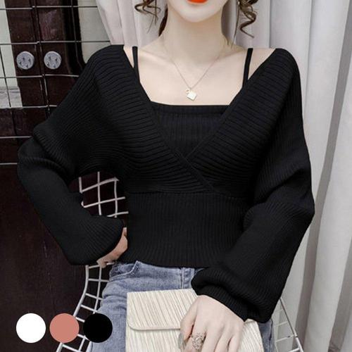 Asure 여성 쇼트 봄 가을 얇은 페이크 투피스 홀터넥 끈나시 맨투맨