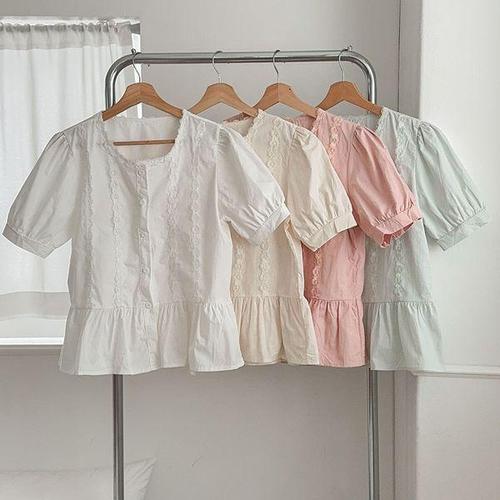 [옷자락]여성 파스텔 레이스 퍼프 소매 프릴 블라우스