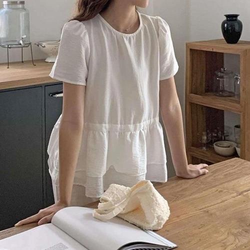데이트룩 여성 라운드넥 청순 프릴 화이트 밴딩소매 블라우스 (WFKBXCJ)