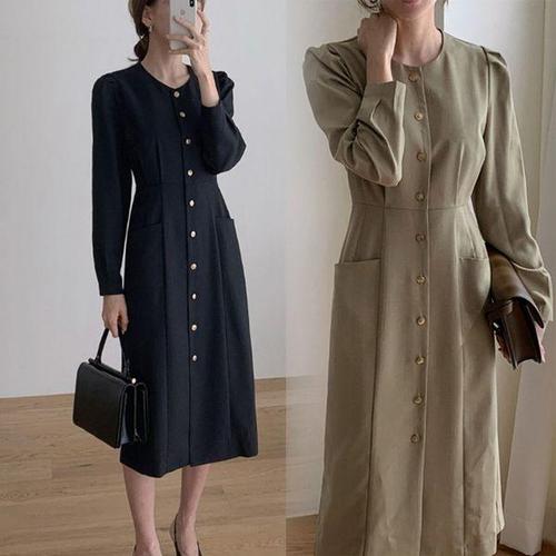 [에이치플러스몰]여성 정장 롱원피스 1P 퍼프 소매 격식 단추 치마