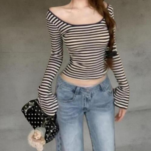 [신상오픈런]|CCT9BBF|여성 오프숄더 숏티 백리본 트임 스트라이프 긴팔 티셔츠_23517055_597559