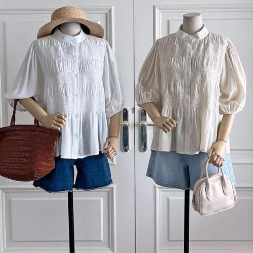 |CSH3C54|여성 벌룬 셔링 블라우스 스모크 밴딩 여름 여행룩
