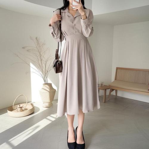 [옷자락]여성 클래식 볼륨업 플레어 카라넥 롱 원피스