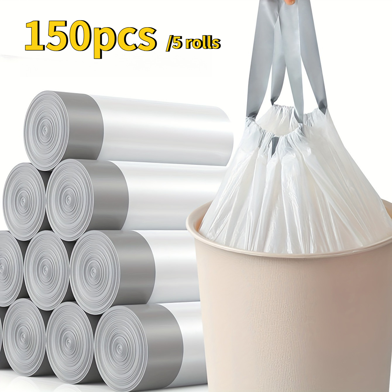 TEMU 고강도 대형 휴대용 쓰레기 봉투 5롤 150매, 조임끈 포함, 흰색 주방 및 욕실용 쓰레기 봉투 라이너, 가정, 사무실, 침실, 식당 청소용