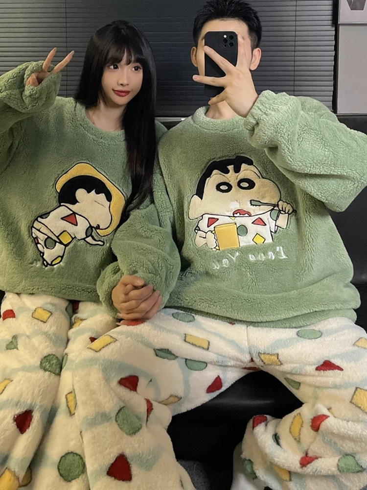 커플 겨울 잠옷 세트 두꺼운 코랄 플리스 안감 귀여운 만화 프린트 캐주얼 홈웨어 부드러운 라운드 넥 긴팔 잠옷