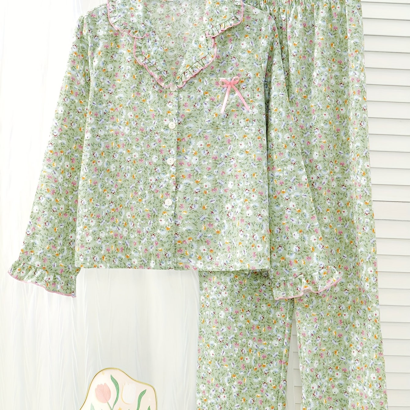 TEMU 세련된 여성용 파자마, 작은 플로럴 리본 장식, 긴소매 탑에 러플 장식, 매칭 긴 바지, 편안한 플로럴 프린트 라운지웨어, 성숙한 여성에게 적합, 플리츠 칼라 카디건과 러플 엣지 포함|잠옷|파자마