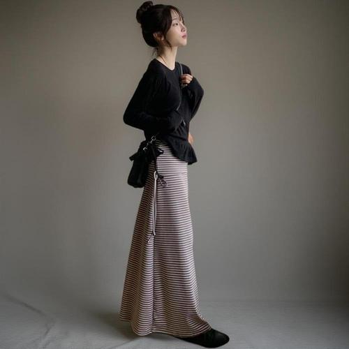 |KMK18A8|여성용 캐주얼 스트라이프 롱스커트 편안한 데일리 치마