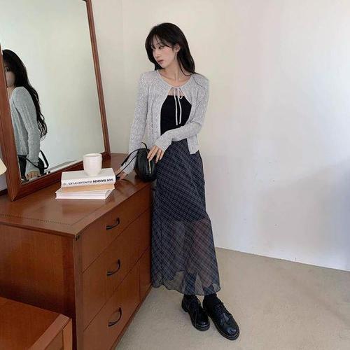 [옷자락] 여자 데이트룩 로맨틱 체크 플레어 롱스커트