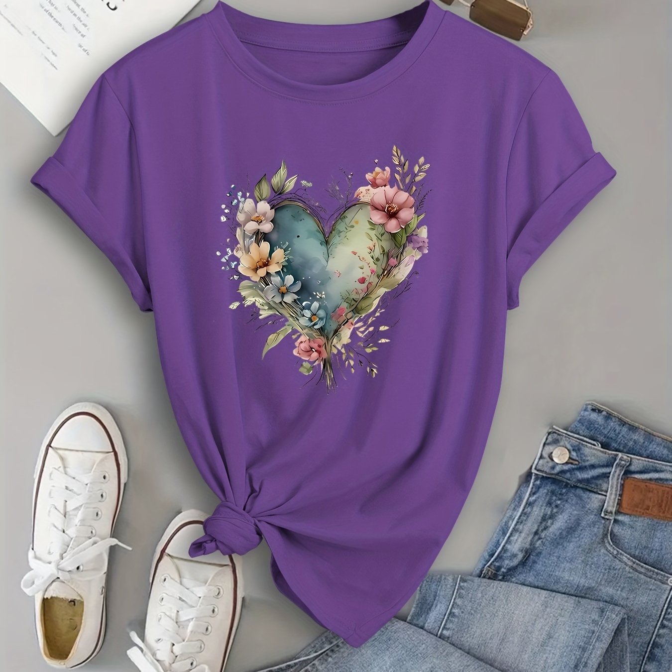 TEMU 여성용 플로랄 하트 프린트 반팔 티셔츠 - 100% 폴리에스터 통기성 여름 상의, 편안한 핏 라운드 넥 캐주얼 티, 생생한 꽃무늬 디자인, 세탁기 사용 가능