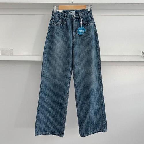 [신상오픈런]여자 스트라이프 빅사이즈 통 일자 속밴딩 워싱 청바지