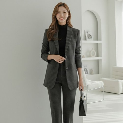 스타일라떼 / 겨울 스트라이프 싱글 투버튼 자켓 여성 스판 정장 재킷 오피스룩 하객코디