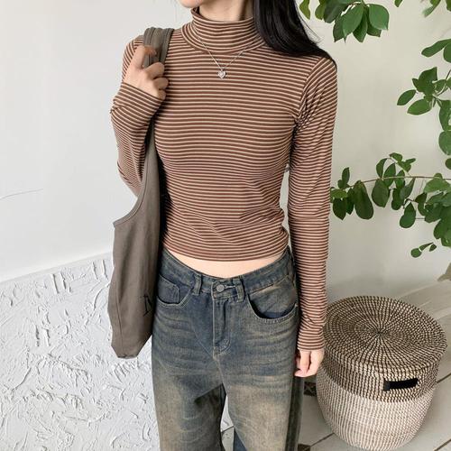[옷자락]여성 폴리 스판 스트라이프 크롭 폴라 긴팔 티