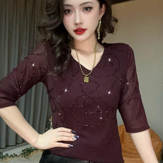 페이준 여성 봄 가을 망사 핫픽스 블라우스 슬림핏 캐주얼 칠부 소매 빅사이즈 댄스복 티셔츠 LN088