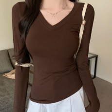 플리스 안감 긴팔 반팔 티셔츠 여성용 스위트 스타일 U넥 슬림핏 베이스 셔츠 가을 겨울 따뜻한 패션 탑