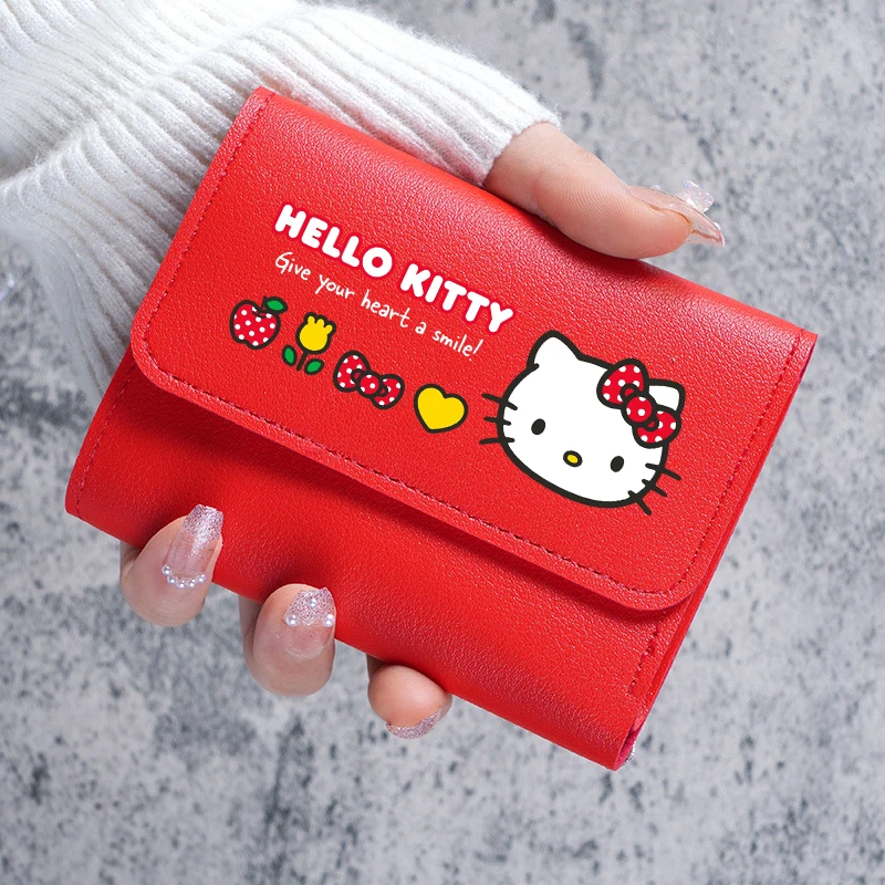 헬로 키티 이중 접이식 짧은 지갑, 단색 짧은 지갑, 다중 수납 공간 디자인의 슬림하고 가벼운 PU 가죽 카드 홀더