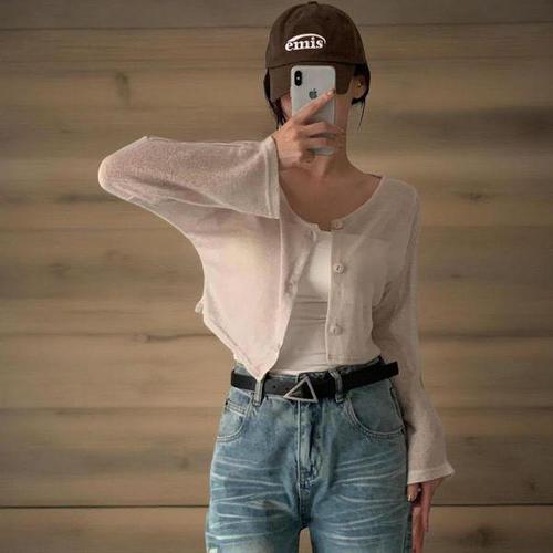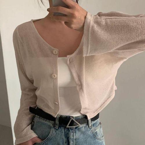 [신상오픈런]여성 시스루 크롭 긴팔 가디건 심플 라운드넥
