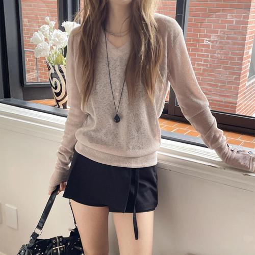 [옷자락] 여자 린넨혼방 브이넥 루즈핏 시스루 소매버튼 니트