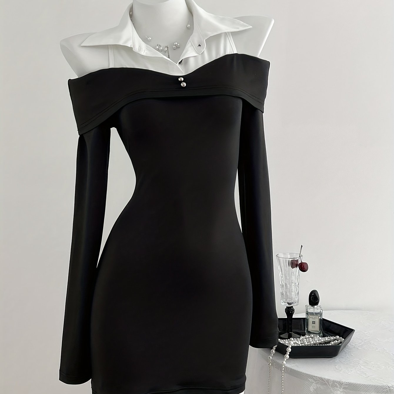 TEMU 여성 컬러 블록 셔츠 칼라 오프숄더 긴팔 캐주얼 숏 드레스|반팔블라우스