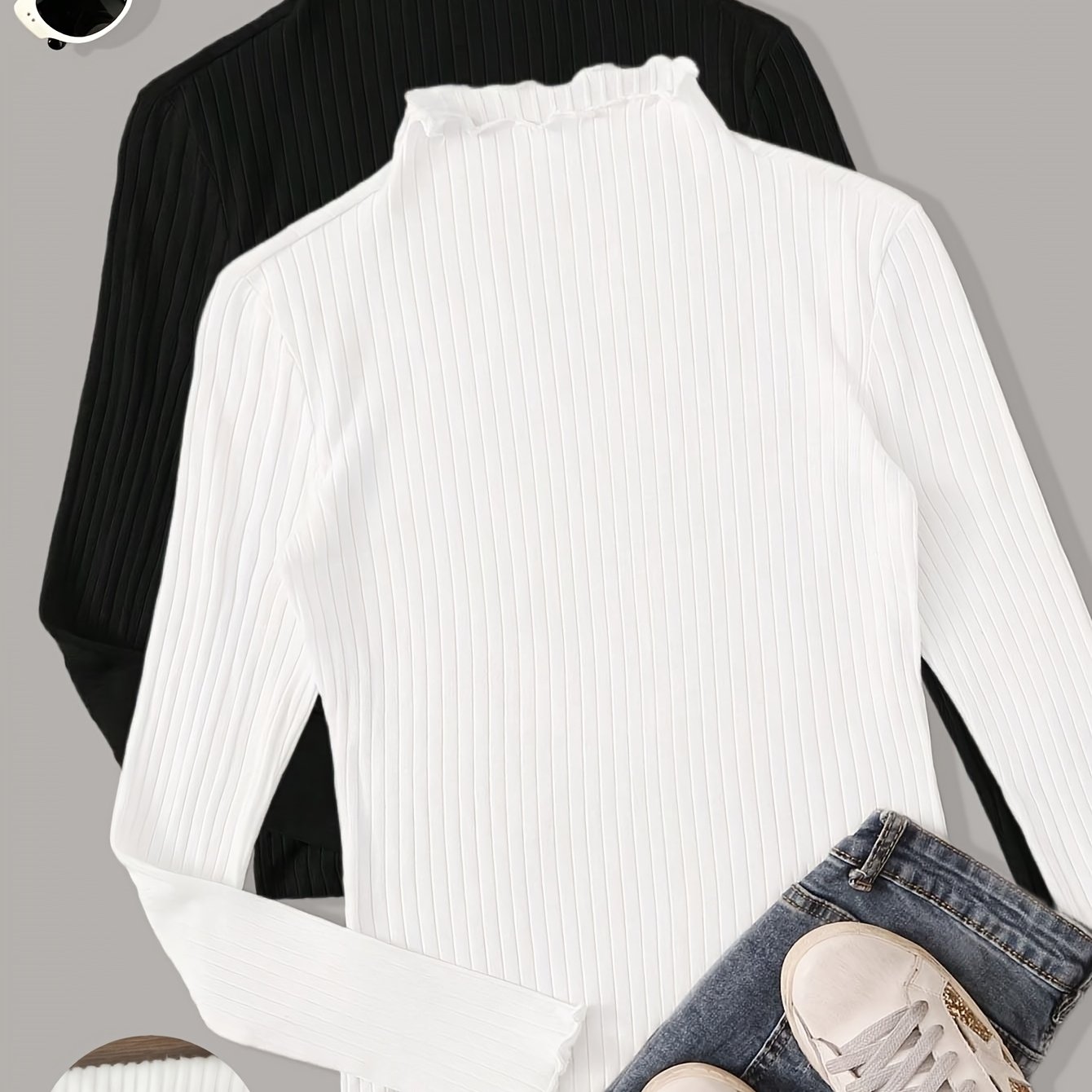 TEMU 플러스 사이즈, 핫셀링 캐주얼 하이넥 긴팔 솔리드 컬러 탑 투피스 세트