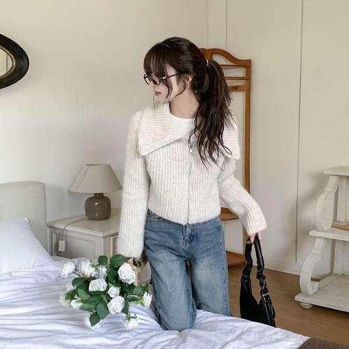 [시크블랙]트베루 세미크롭 하이넥 울 니트 집업 가디건