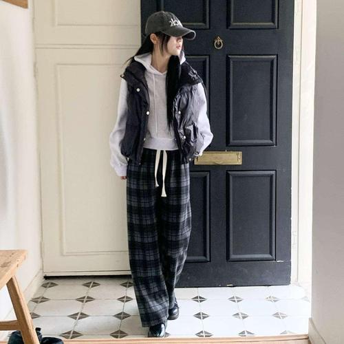 [시크블랙]쿠루네 와이드 체크 밴딩 기모 팬츠