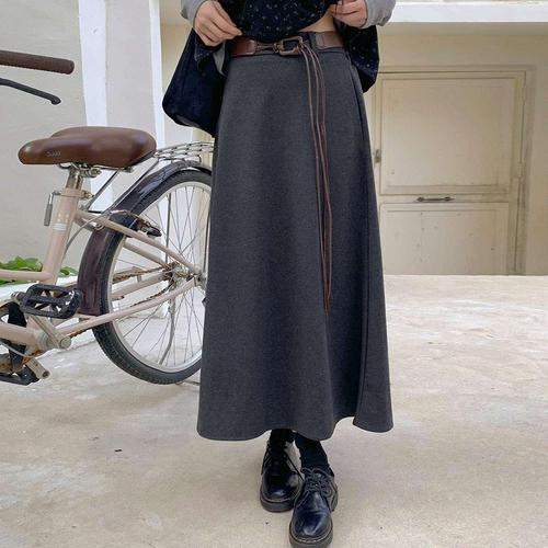 [시크블랙]터케이 가죽 벨트 A라인 모직 롱 스커트