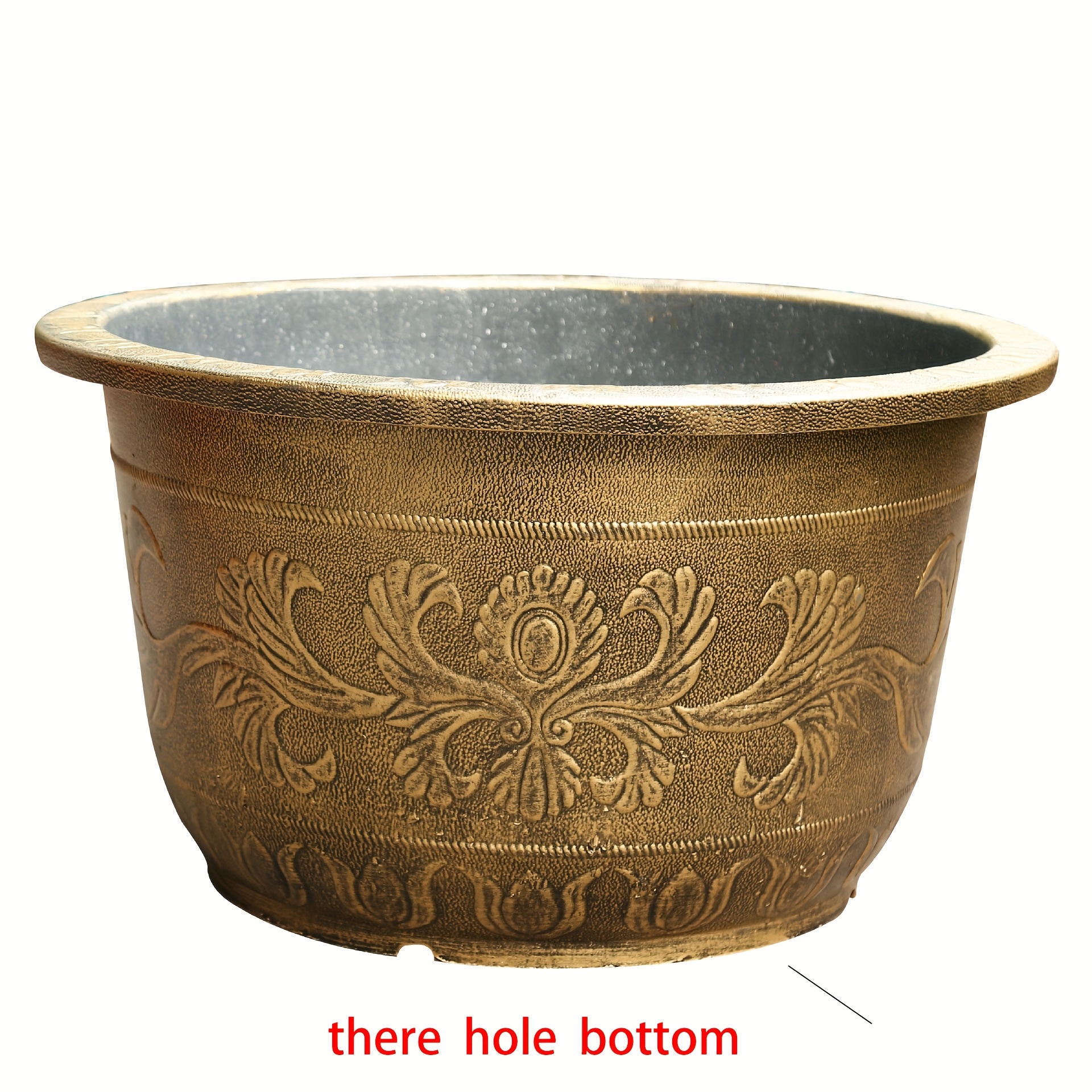 TEMU 우아한 청동색 대형 플랜터, 세련된 꽃무늬 패턴 - 내구성 있는 플라스틱, 배수 구멍이 있는 또는 없는 듀얼 스타일, 물을 사용한 재배에 이상적, 연꽃, 물고기, 등에 적합 - 실내/실외 사용, 실내용 식물용 그릇 | 장식용 플랜터 | 빈티지 스타일 그릇, 꽃용|화분