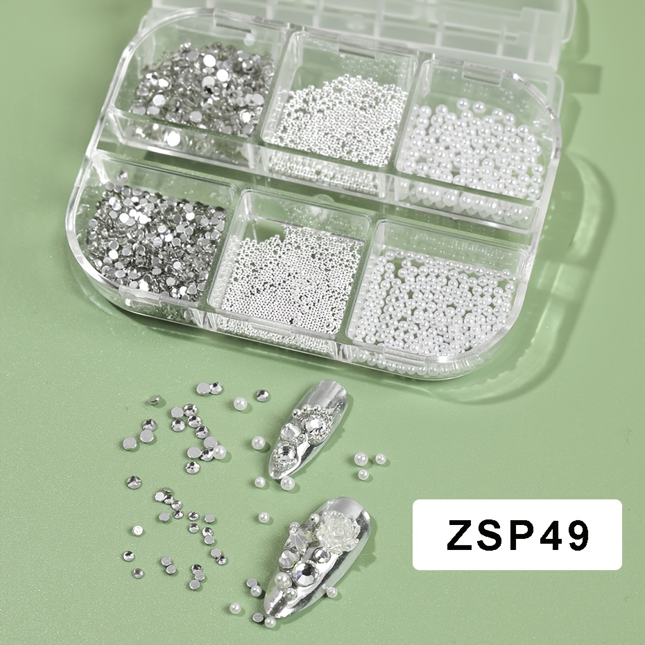 TEMU 6구 3D 네일 아트 라인스톤 화이트 라운드 네일 장식 참 스틸 비즈 보석 스톤 주얼리 네일 부속품
