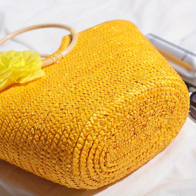 TEMU 여성 핸드메이드 여름 비치 스트로우 백, 패션 플로럴 패턴 백 - 장식적인 플로럴 장식이 있는 크레센트 탑 핸들 토트백, 옐로우 우븐 디자인, 여행 및 야외 활동에 적합, 비치 백, 여름 나들이