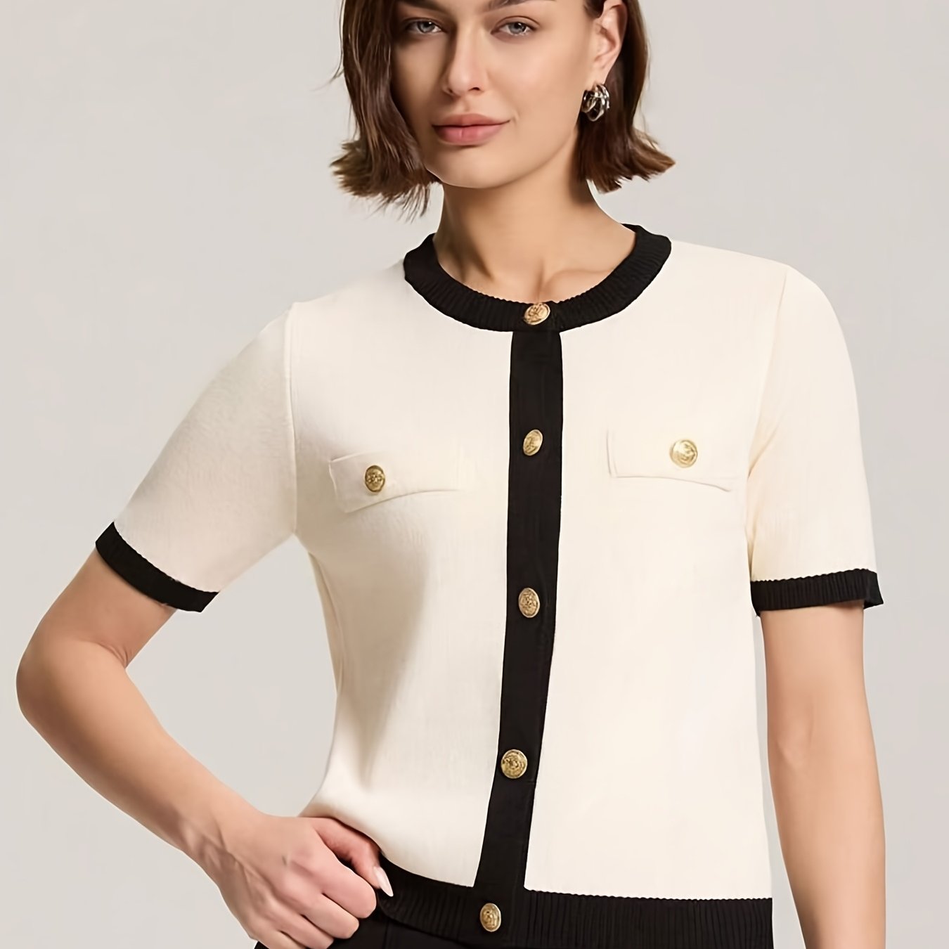 TEMU 여성용 캐주얼 컬러블록 가디건 - 앞면 버튼 클로저, 블랙 & 화이트 대비 트림 반팔 라운드넥 스웨터, 세탁기 사용 가능 내구성 봄/가을 레이어링 아이템, 다재다능한 캐주얼 의상, 시즌 패션, 우아한 디자인, 고품질 스티칭, 스타일리시 탑, 트렌디 아웃핏, 가벼운 소재, 버튼업 탑, 트렌디한 옷장, 클래식 스웨터, 에틸레틱 스타일, 롱라인 가디건