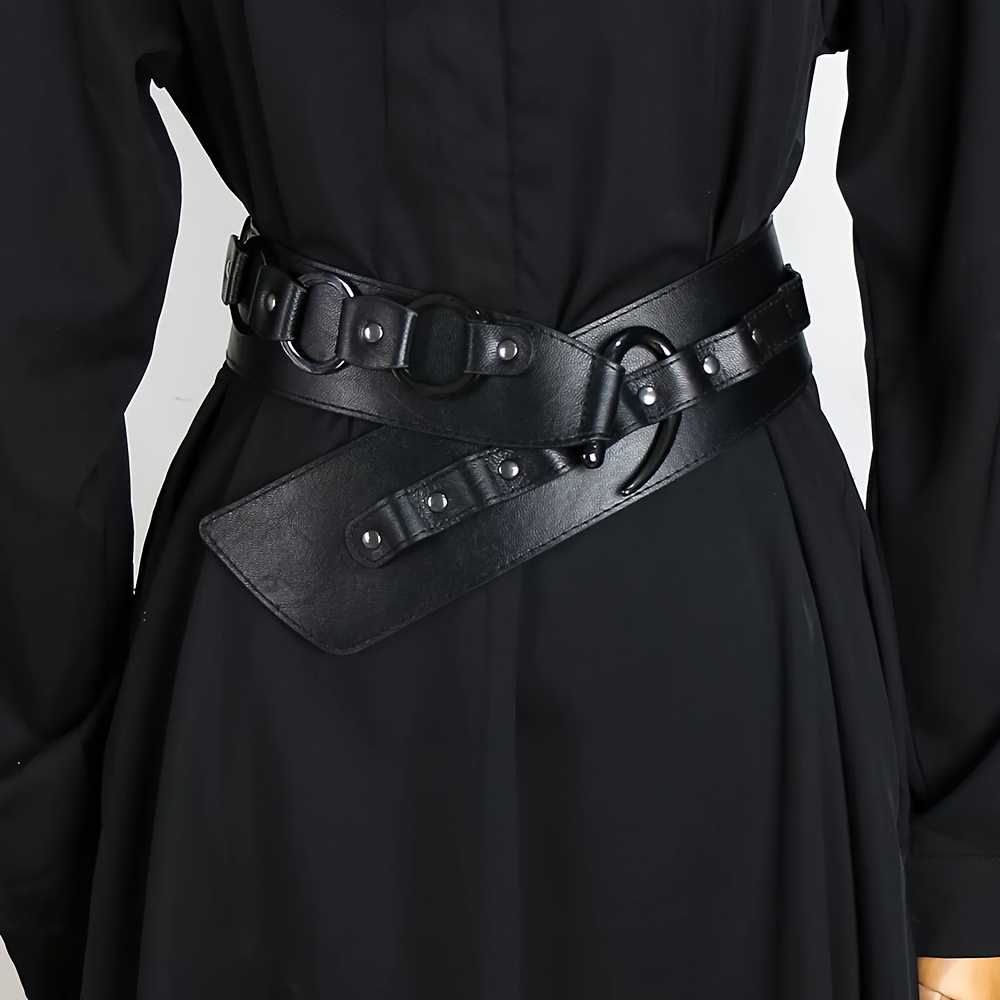 TEMU 빈티지 고딕 디자인 여성 벨트 - 블랙 메탈 버클과 원형 링 장식, 패셔너블 Y2K 스타일 웨이스트 신처, 드레스, 스웨터, 코트와 다양한 스타일링 가능