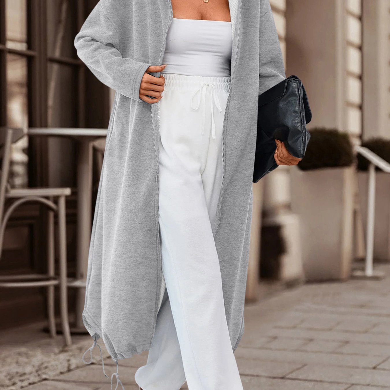 TEMU 여성을 위한 롱 후드 집업 코트입니다. 가을, 겨울 시즌에 적합합니다. 단색이며, 편안함을 위한 약간의 스트레치가 있는 원단을 사용했습니다. 코트는 긴 길이, 후드, 지퍼로 디자인되었습니다.