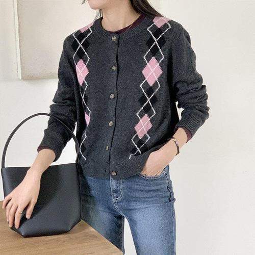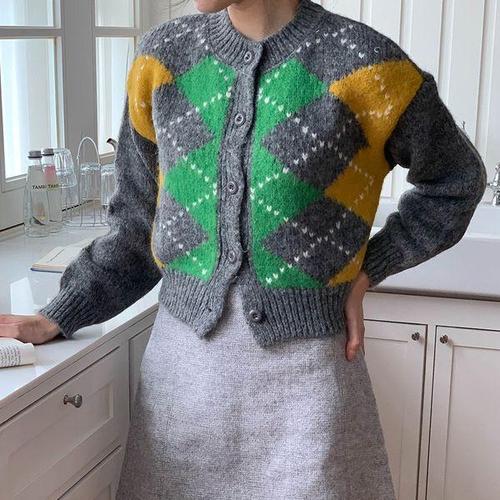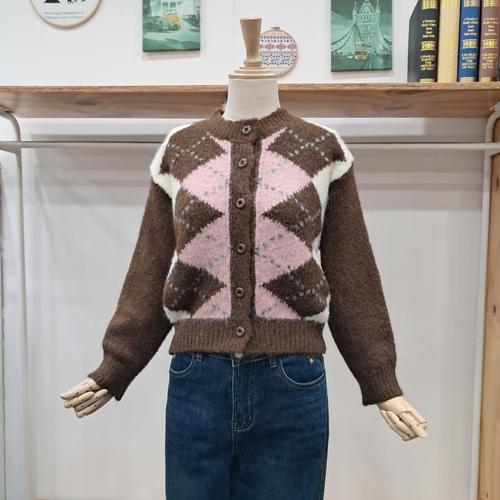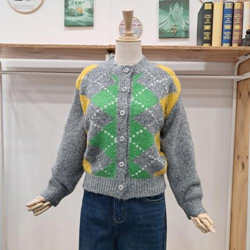 [옷자락]여자 배색 비비드 패턴 아가일니트 라운드넥 가디건
