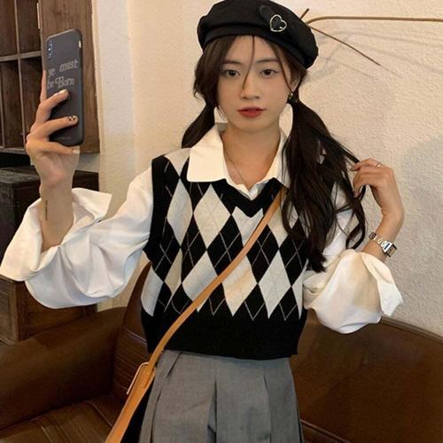[셀럽하우스]러블리 KQHQ1767 여자 아가일 패턴 크롭기장 니트조끼