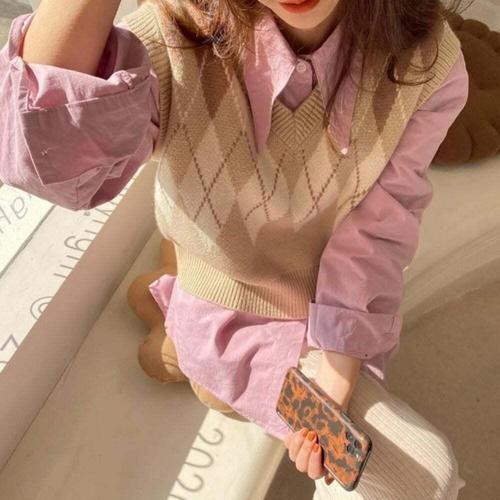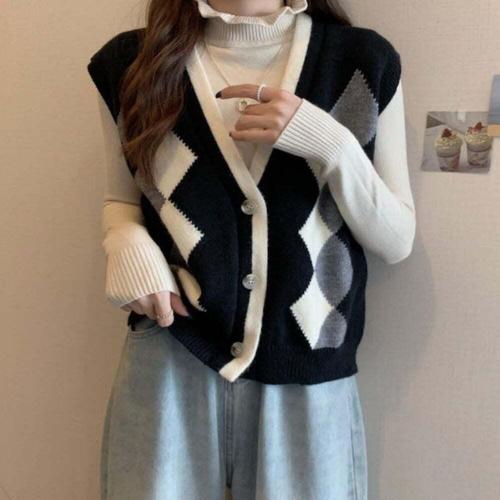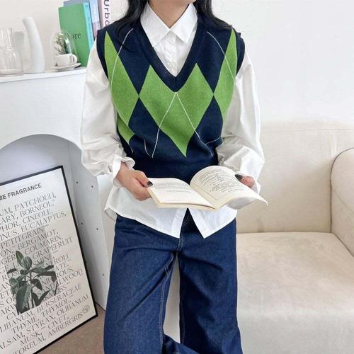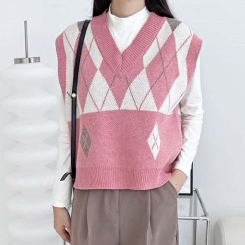 [셀럽하우스]러블리 BWZO5210 아가일 패턴 여자 브이넥 베스트 니트조끼