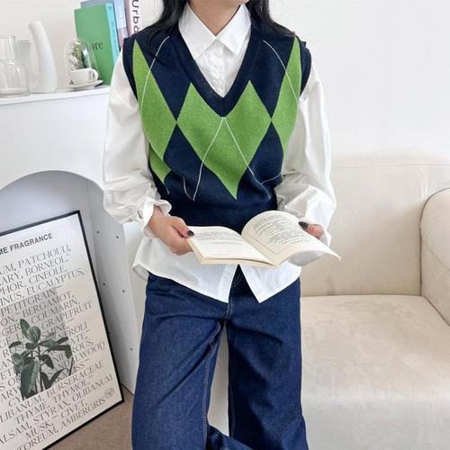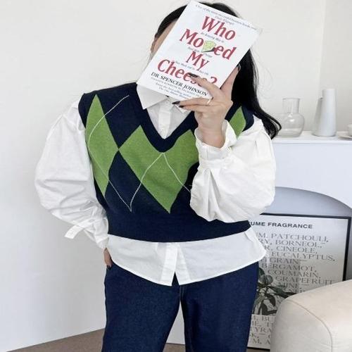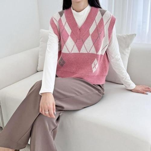 [옷자락] 여자 개강룩 쟈가드 아가일 배색 라운드 니트조끼