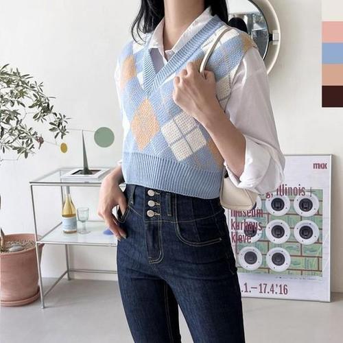 [셀러허브_여성트랜드패션]아가일니트조끼 여자브이넥 여자상의