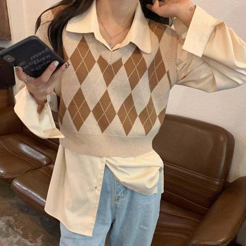 [셀럽하우스]여성 SNEK6852 아가일 레이어드 니트조끼 브이넥 니트 베스트