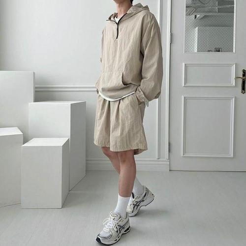 빅사이즈 여성 여름 트레이닝 투피스 루즈핏 슬림 아노락 반집업 자수 후드반팔티 캐주얼 스트링 순색 반바