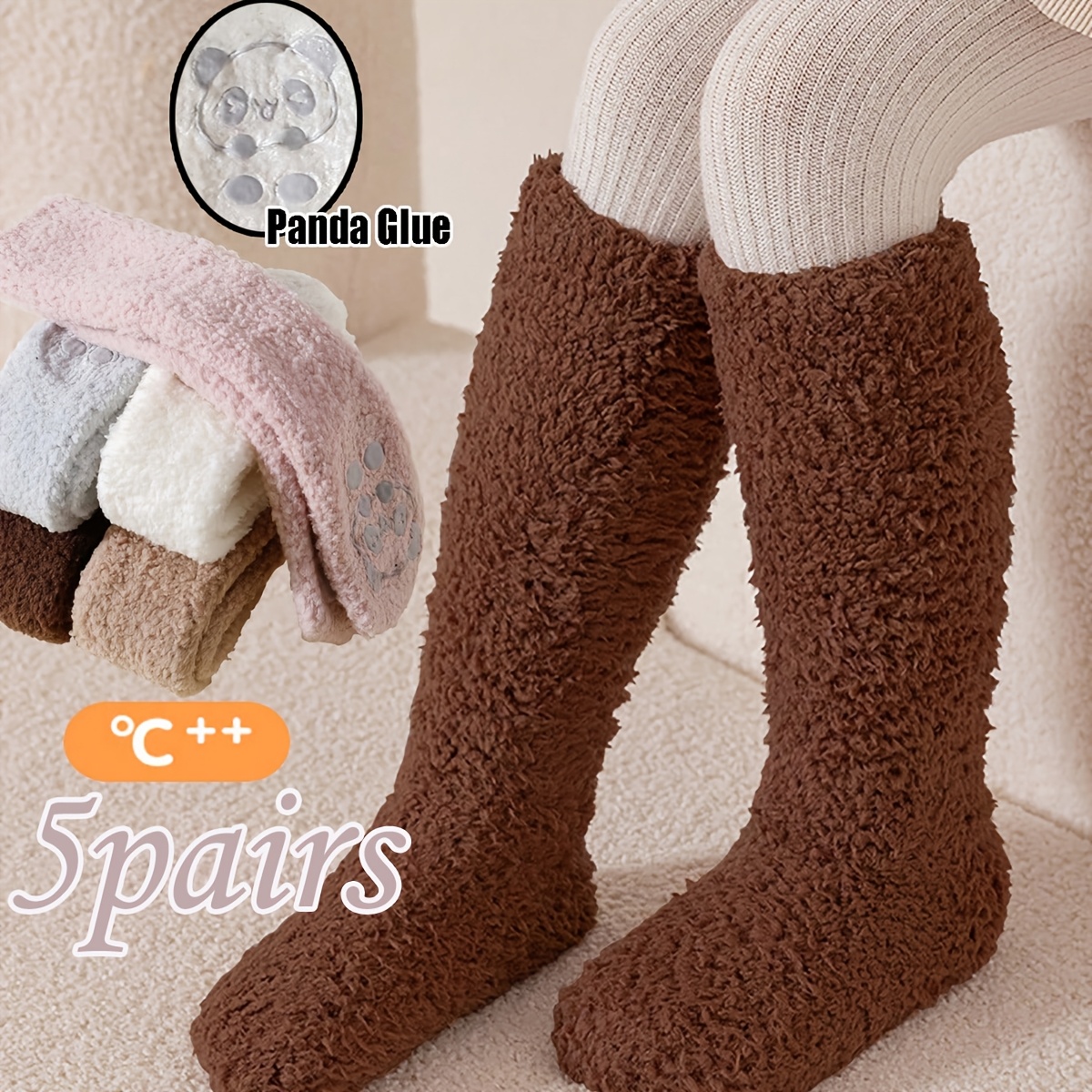 TEMU 코랄 보온 양말 5켤레 - 팬다 도트 접착 밑창 겨울용 따뜻한 바닥 양말, 귀여운 팬다 디자인의 미끄럼 방지 유아용 신발, 손세탁 가능, 날씨 관리 ()