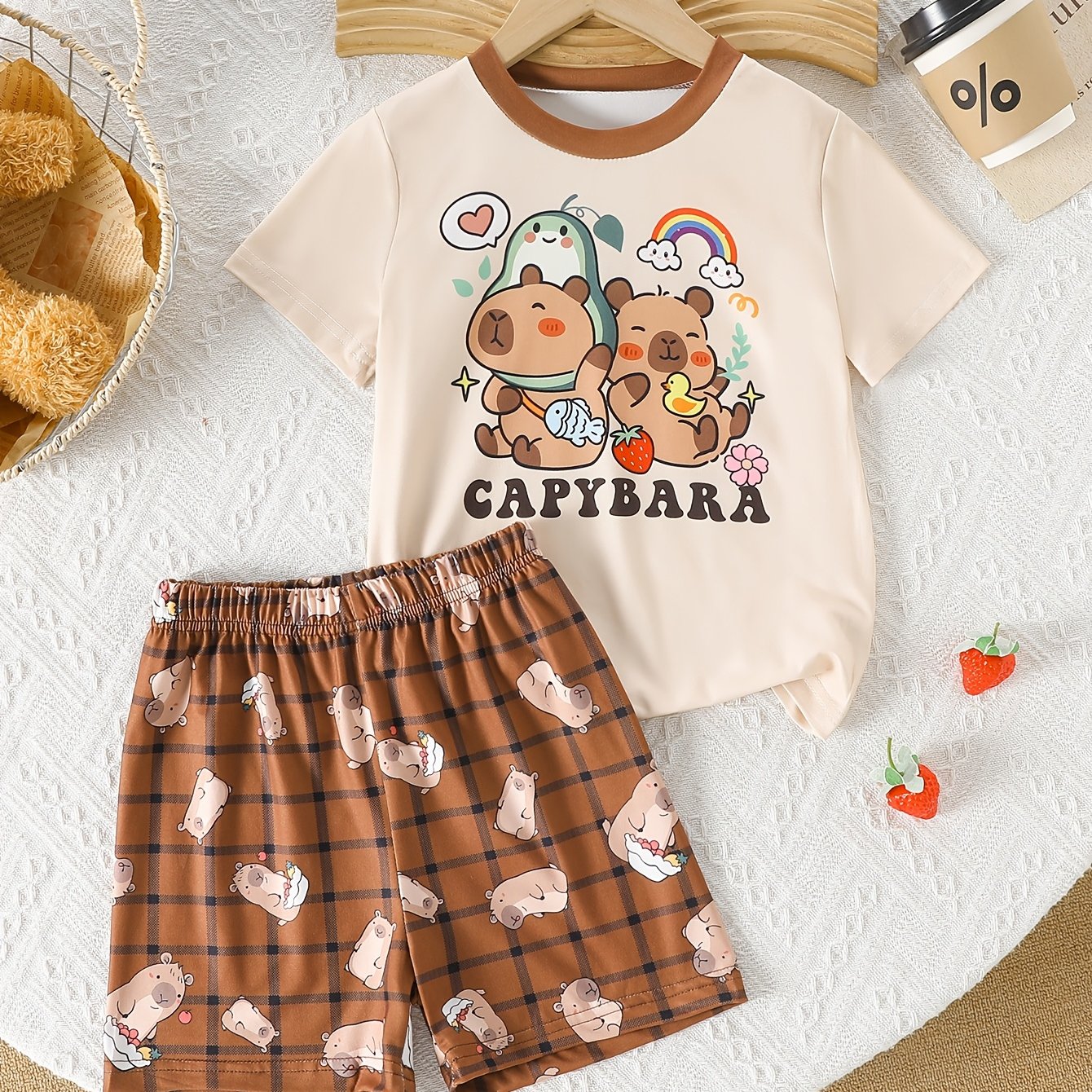 TEMU 어린이 의류: 소년용 패션 카툰 카피바라 프린트 반팔 셔츠와 체크무늬 반바지, 4-12세, 소녀용 홈웨어 파자마 세트, 야외 착용 가능, 난연 소재