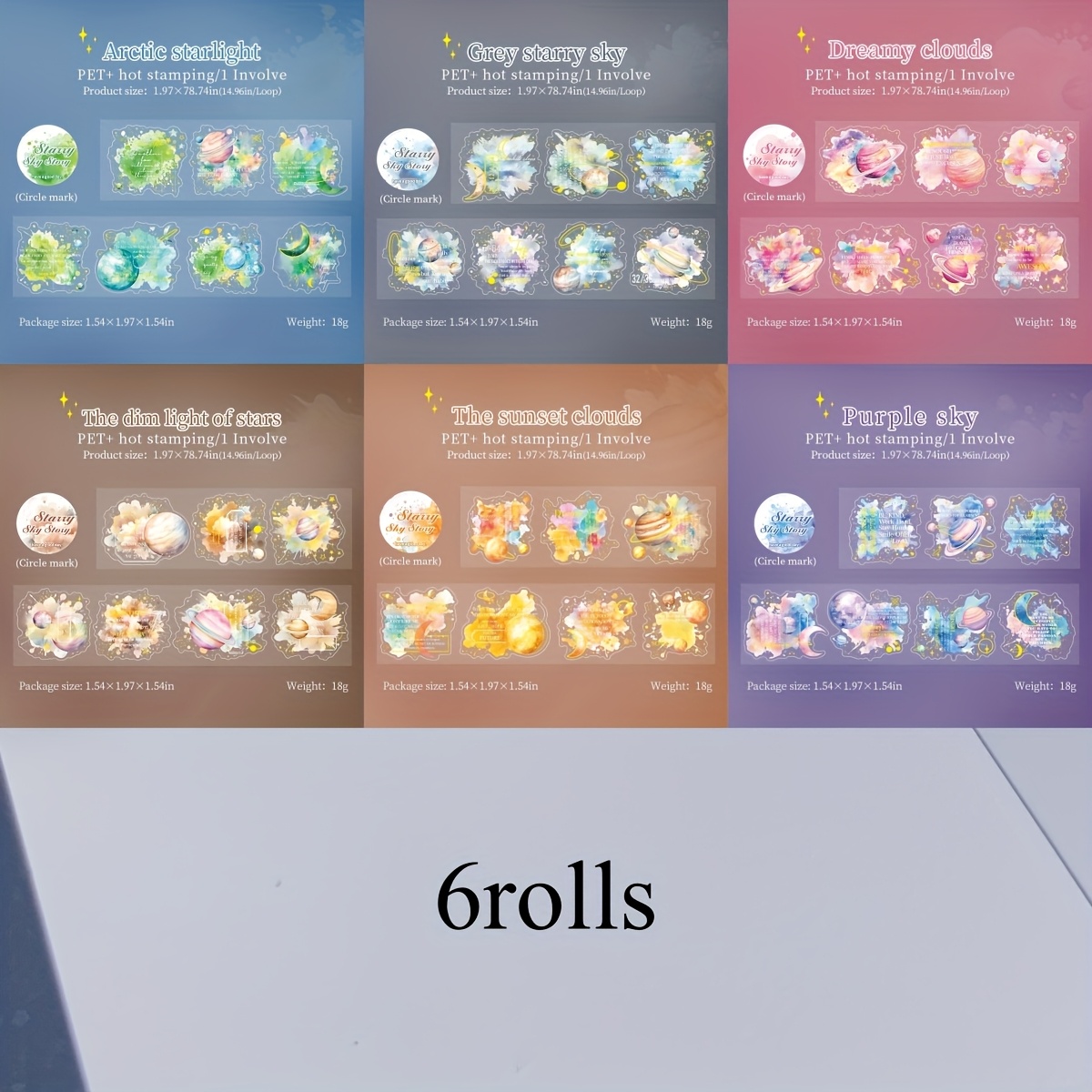TEMU 6롤 - 5cm × 200cm 별이 빛나는 하늘 이야기 테이프, PET 소재 방수 내구성, 다이컷 및 접착식 뒷면, 불릿 저널 배경, DIY 휴대폰, 인사말 카드, 컵, 플래너, 액자 장식, 문구류 사용, 잡지 저널, 공예 책 종이, DIY에 적합 - 창의적인 예술 및 수공예, 휴일 장식에 완벽!