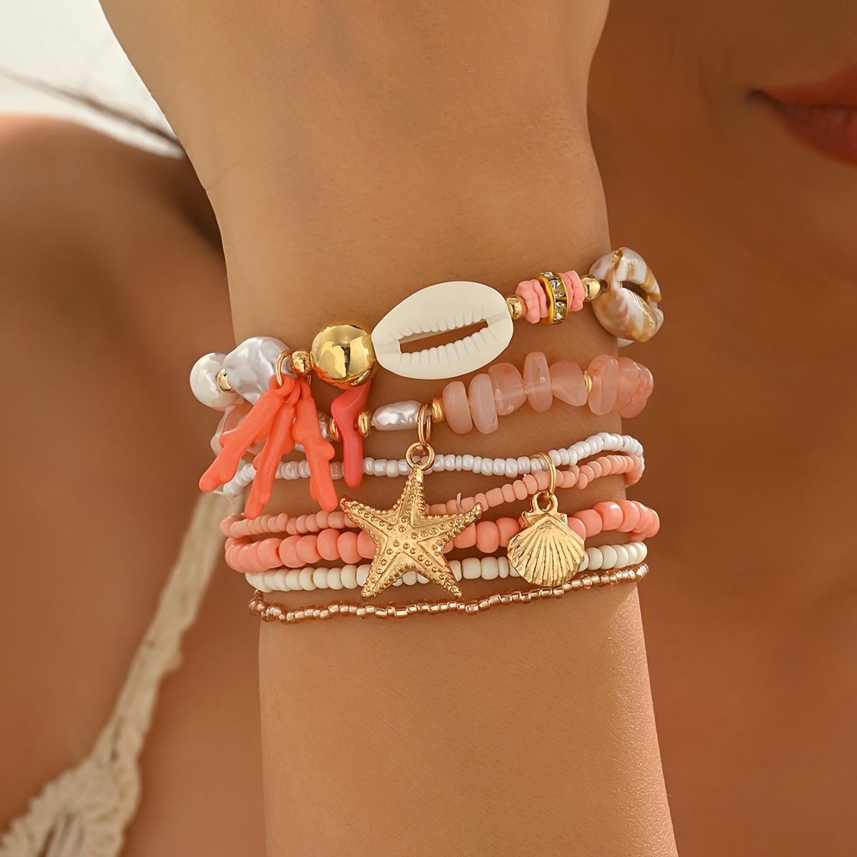 TEMU 여성을 위한 매일 착용할 수 있는 스타피시, 조개 및 산호 액세서리가 있는 6개 세트의 손수 만든 비즈 팔찌 세트 - 여성용 다층 스택 가능한 신축성 있는 패션 바다 영감을 받은 보석