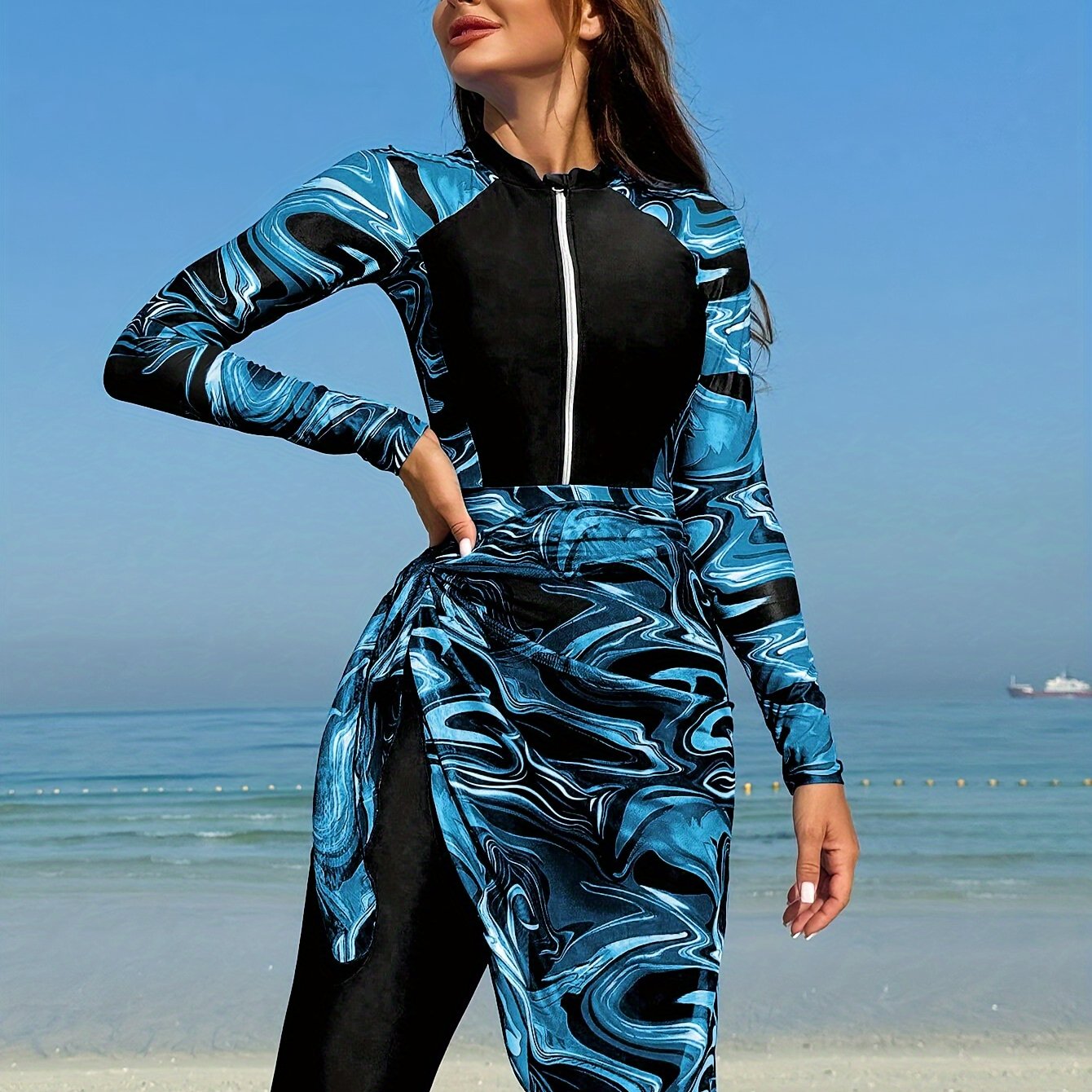 TEMU 마블 프린트 우아한 2조각 수영복, V 넥 고스트레치 원피스 수영복 및 커버업 사롱 스커트, 여성 수영복 및 의류