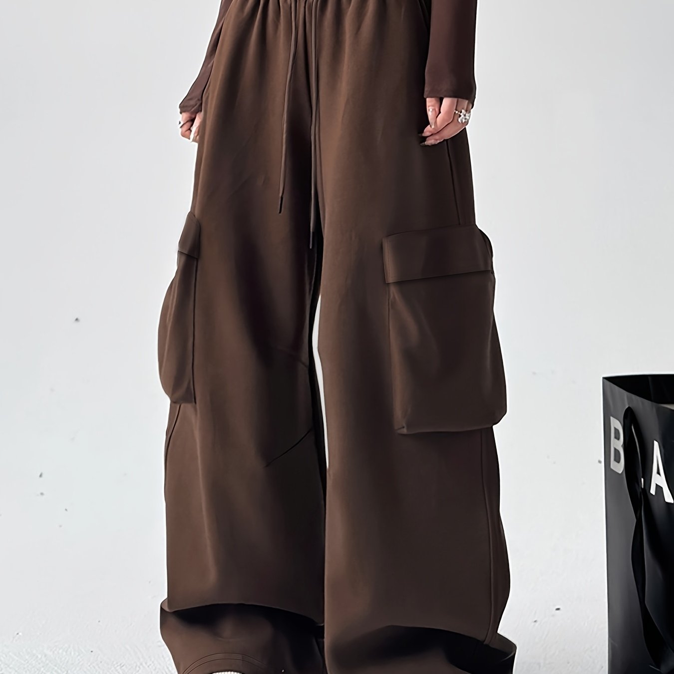 TEMU 여성용 솔리드 컬러 와이드 레그 멀티포켓 드로스트링 하이웨이스트 카고 스웨트팬츠, 캐주얼 팬츠